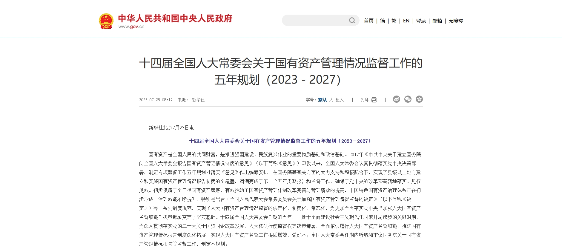 十四届全国人大常委会关于国有资产管理情况监督工作的五年规划(2023-2027)