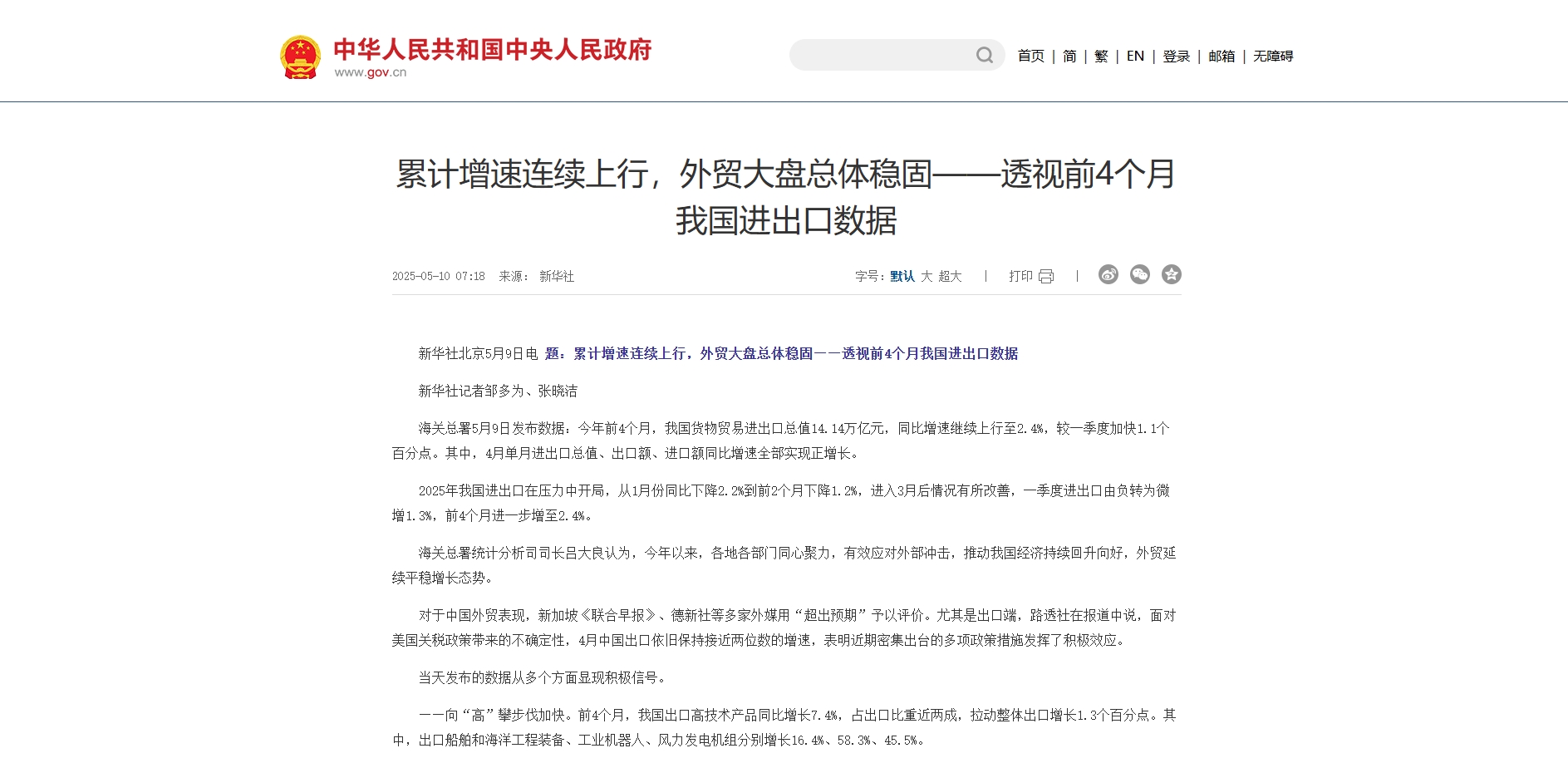 累计增速连续上行,外贸大盘总体稳固——透视前4个月我国进出口数据
