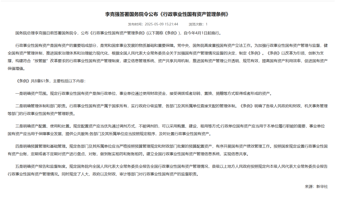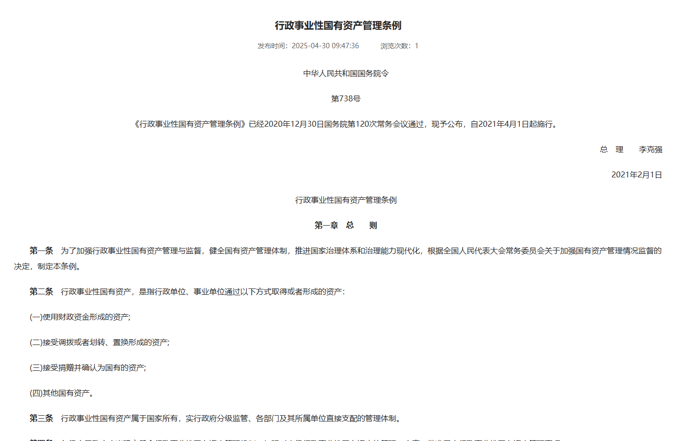 李克强签署国务院令公布《行政事业性国有资产管理条例》
